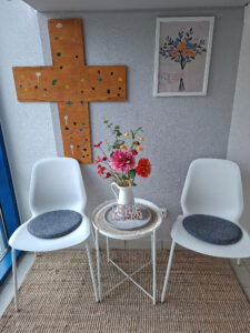 Zu Besuch und im Gespräch: Julia Linneweber-Männer mit V. Wowra-Weis und K. Glöckeler beim 20 jährigen Jubiläumsfest des Dachverband der Elterninitiative Augsburg am 15.Juni 2024 im Annahof.